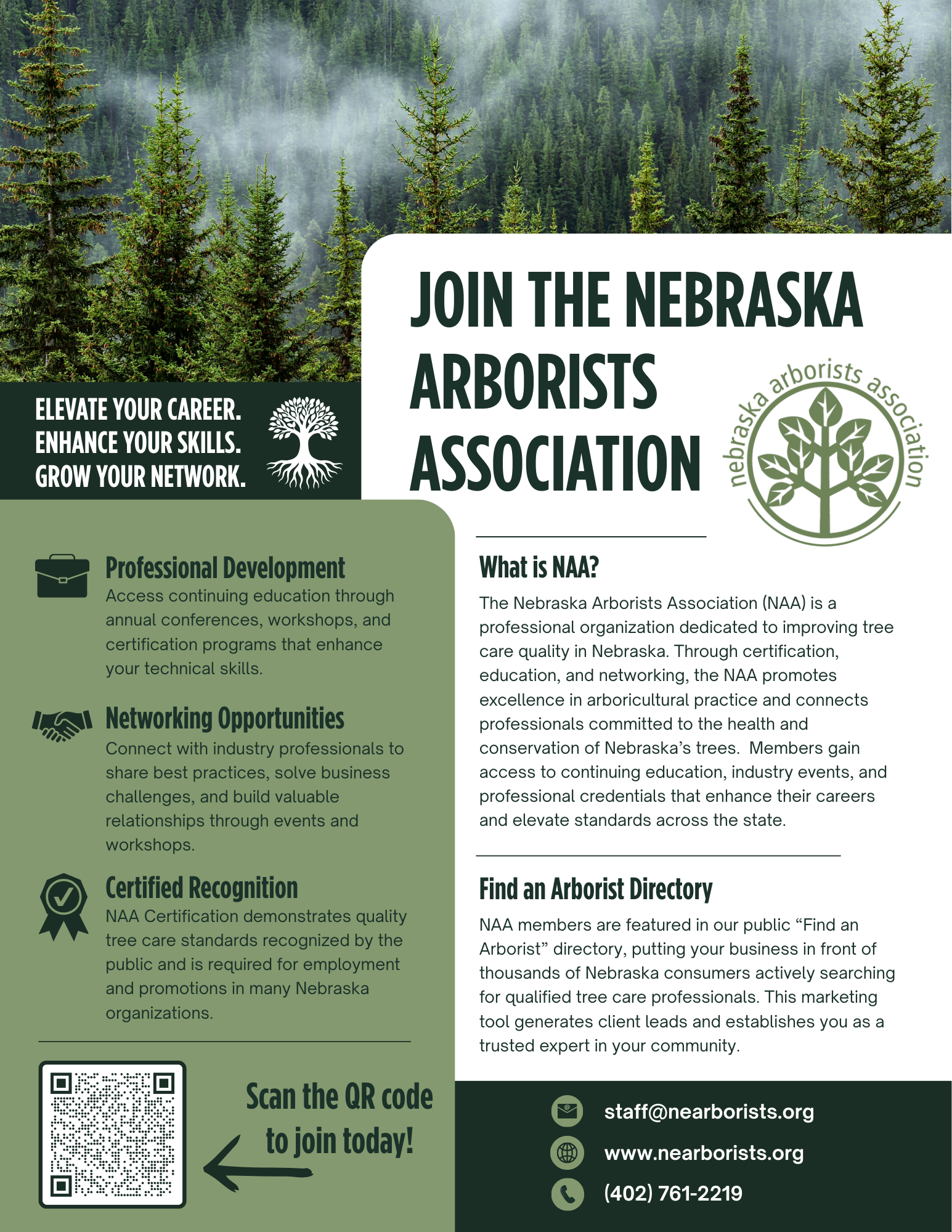 Members of the NAA enjoy a quarterly newsletter, linking them to timely information on arboriculture topics and issues in Nebraska and educational opportunities in Nebraska and surrounding areas. Members receive discounts on registrations to quality continuing education events and NAA Certification. Members also benefit from representation on legislative issues addressed by the Nebraska Legislature.
